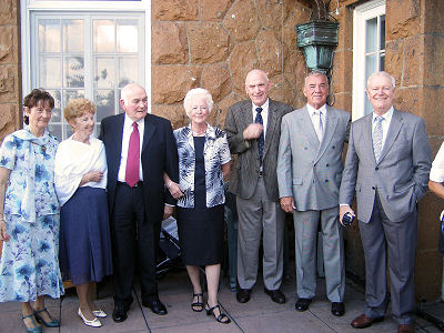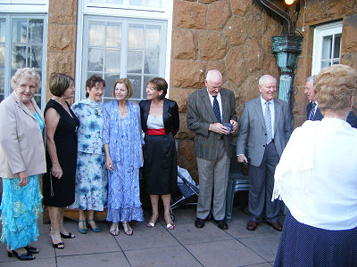 Some members tarry for a photo on the steps before joining the party at a |