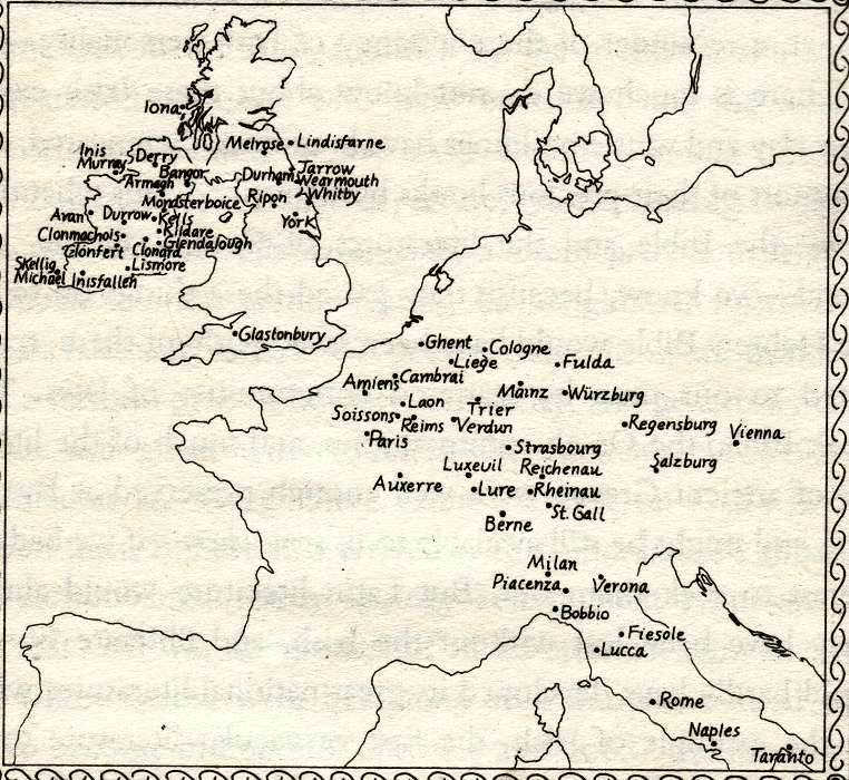 As Irish monasteries had quickly attracted thousands of foreign students, the Irish monastic tradition began to spread beyond Ireland and, as the learned Thomas Cahill puts it in 'How the Irish Saved Civilisation', "Columcille's reputation spread like wildfire". He was mostly responsible for reconnecting illiterate Europe to its literate past 'by way of scribal Ireland'. The other Columba, Columbanus*, following in the steps of the great Columcille, left the monastic community of Bangor for the continent in 590, just seven years before Columcille's death. Historians are still assessing his tremendous influence there. Fursa went to East Anglia (England) and Gaul around 633 to establish Irish foundations of learning. In 635 King Oswald of Northumbria sent to Iona for a missionary to convert his people to Christianity. Aiden was chosen for the task and with his twelve followers or fellow monks established a monastery at Lindisfarne , near the King's castle at Bamburg. Lindisfarne flourished under Aiden and Finian. In 660 AD Colmáin* (Colman) who was a member of Uí Fiachrach Mauide of north Connacht and who had received his education at Iona was appointed Bishop-Abbot of Lindisfarne. *Click here for more on the Irish Monastic Tradition |
